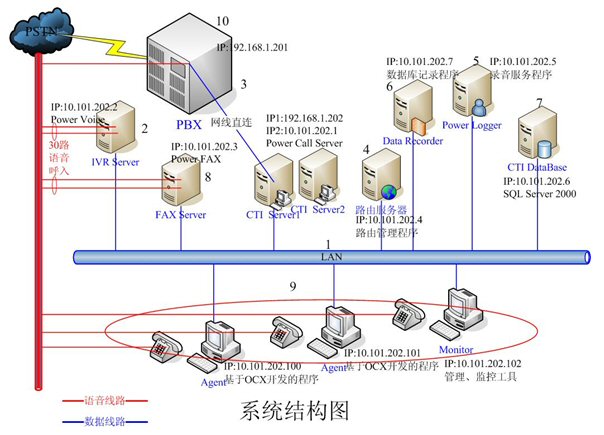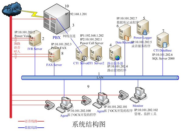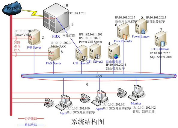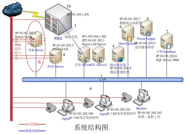 - IVR Server和FAX Server采用高品質(zhì)的工控機(jī),配置和軟件環(huán)境基本一樣。每臺(tái)機(jī)器均有30路語(yǔ)音接入,分別裝有一套Power