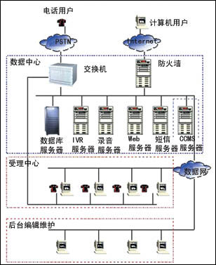 系統(tǒng)的體系結(jié)構(gòu),主要包括三個(gè)部分:數(shù)據(jù)中心、受理中心和維護(hù)中心。受理中心與數(shù)據(jù)中心之間采用E1連接,具有2M的數(shù)據(jù)通信能力;維護(hù)中心與數(shù)據(jù)中心之間采用64K DDN線(xiàn)路連接,三個(gè)中心分布在三個(gè)不同的地方。目前受理中心負(fù)責(zé)全省的所有業(yè)務(wù),客戶(hù)通過(guò)本地市話(huà)經(jīng)由移動(dòng)電信網(wǎng)絡(luò)將話(huà)路指向受理中心,通過(guò)數(shù)據(jù)中心的具有排隊(duì)功能的交換機(jī),根據(jù)被叫號(hào)碼和客戶(hù)服務(wù)要求,將講話(huà)路轉(zhuǎn)接到自動(dòng)臺(tái)或人工臺(tái)席,為客戶(hù)提供服務(wù)。當(dāng)用戶(hù)呼叫信息臺(tái)電話(huà)后,進(jìn)入到交換機(jī),交換機(jī)將來(lái)話(huà)消息通知驅(qū)動(dòng)池,驅(qū)動(dòng)池將相關(guān)消息轉(zhuǎn)換為標(biāo)準(zhǔn)格式,通知CCMS,CCMS根據(jù)來(lái)話(huà)被叫號(hào),根據(jù)管理系統(tǒng)的定義,啟動(dòng)相應(yīng)的IVR腳本,交給IVR解釋器解釋并由IVR服務(wù)器執(zhí)行,當(dāng)服務(wù)為自動(dòng)臺(tái)完成時(shí),由IVR服務(wù)器實(shí)現(xiàn)(如:語(yǔ)音引導(dǎo)、適合自動(dòng)服務(wù)的內(nèi)容等);當(dāng)用戶(hù)需要人工服務(wù)時(shí),CCMS管理系統(tǒng),根據(jù)用戶(hù)的服務(wù)要求,按照話(huà)路分配原則(通過(guò)管理系統(tǒng)定義),選擇最合適的話(huà)務(wù)員為其服務(wù),同時(shí)CCMS管理系統(tǒng)會(huì)將相關(guān)的頁(yè)面在話(huà)務(wù)員的臺(tái)席上顯示出來(lái),同時(shí)顯示主叫號(hào)碼以及來(lái)話(huà)標(biāo)示,當(dāng)話(huà)務(wù)員應(yīng)答后,即可開(kāi)始受理,受理的內(nèi)容通過(guò)Web服務(wù)器完成,同時(shí)對(duì)于需要查詢(xún)數(shù)據(jù)庫(kù)的訪(fǎng)問(wèn),通過(guò)應(yīng)用服務(wù)器,進(jìn)行數(shù)據(jù)訪(fǎng)問(wèn),并返回結(jié)果。當(dāng)服務(wù)完畢,本次呼叫即結(jié)束。
