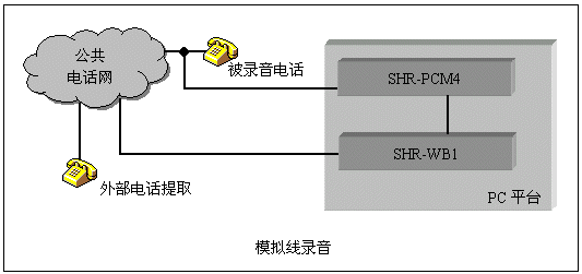 三匯公司的SHR系列監(jiān)控錄音卡可以實(shí)現(xiàn)對(duì)電話線路或其它信號(hào)源如話筒信號(hào)、對(duì)講機(jī)等進(jìn)行錄音。模擬線錄音采用高阻抗并線的方式,對(duì)被錄音對(duì)象無影響。可以檢測(cè)電話線上直流電壓、DTMF號(hào)碼、FSK/DTMF CallerId等信號(hào)。采用配套的高阻復(fù)接盒,SHD系列數(shù)字中繼卡還能完成對(duì)數(shù)字中繼線的監(jiān)控錄音,并能分析線路上的信令,從而取得通話狀態(tài)和主被叫號(hào)碼。這兩種錄音系統(tǒng)的結(jié)構(gòu)如下圖: