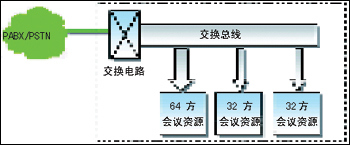 在圖1中,系統(tǒng)擁有一個(gè)64方、兩個(gè)32方共三組會(huì)議資源,也就是說(shuō),這個(gè)系統(tǒng)最多可同時(shí)召開(kāi)一個(gè)64方會(huì)議和兩個(gè)32方會(huì)議。由于各會(huì)議組之間無(wú)法共享資源,所以既不能召開(kāi)所有話路均參加的大會(huì),也不能同時(shí)召開(kāi)大量的小型會(huì)議。