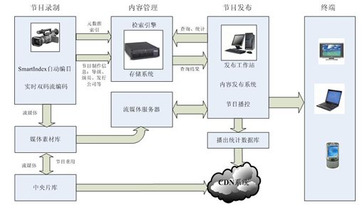 節(jié)目制作平臺主要負(fù)責(zé)節(jié)目的采編,接收節(jié)目源的數(shù)字視頻信號和模擬視頻信號進(jìn)行實(shí)時(shí)/超實(shí)時(shí)的轉(zhuǎn)碼,并同時(shí)進(jìn)行自動(dòng)編目、歸檔,滿足系統(tǒng)不同應(yīng)用的要求。另外,各資源建設(shè)成員單位或各地、州、市遠(yuǎn)程辦按照省遠(yuǎn)程辦的統(tǒng)一部署,加工各自類別的課件,采用人工傳送介質(zhì)或利用VPN實(shí)現(xiàn)專網(wǎng)的方式送交到資源庫系統(tǒng)中,實(shí)施統(tǒng)一的存儲(chǔ)和管理。