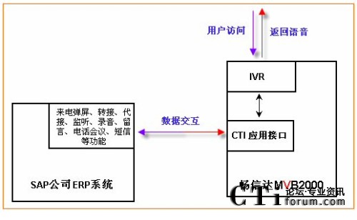 通過(guò)集成,不但可以實(shí)現(xiàn)與SAP公司ERP系統(tǒng)的實(shí)時(shí)數(shù)據(jù)傳輸,實(shí)現(xiàn)客戶管理、日常辦公,并且可使ERP系統(tǒng)上具有:點(diǎn)擊外呼、批量外呼、來(lái)電彈屏、收聽錄音、查看報(bào)表、監(jiān)控電話線路等更多增值功能,詳細(xì)接口內(nèi)容見(jiàn)《MVB2000 WEB開發(fā)接口》。