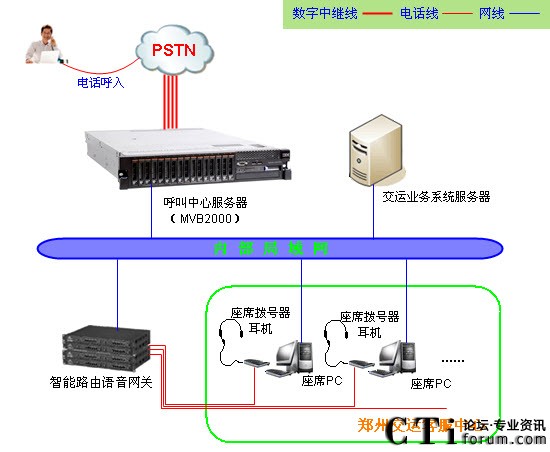 鄭州交運(yùn)服務(wù)熱線采用暢信達(dá)通信MVB2000系統(tǒng)作為交換平臺(tái),采用企業(yè)級(jí)智能路由語音網(wǎng)關(guān)結(jié)合話機(jī)作為座席終端,系統(tǒng)共接入數(shù)字中繼線4條(4E1),座席分機(jī)90臺(tái),系統(tǒng)通過內(nèi)部局域網(wǎng)組網(wǎng),系統(tǒng)架構(gòu)形式如下: