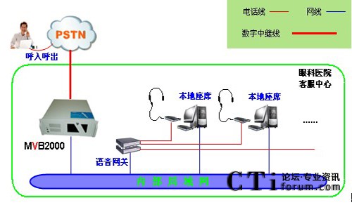 醫(yī)院采用暢信達(dá)通信MVB2000系統(tǒng)作為交換平臺(tái),采用1路E1數(shù)字中繼線接入,對(duì)外公布統(tǒng)一的外線呼入號(hào)碼,采用語音網(wǎng)關(guān)結(jié)合話機(jī)作為座席終端,前期投入8位人工座席,系統(tǒng)架構(gòu)形式如下: