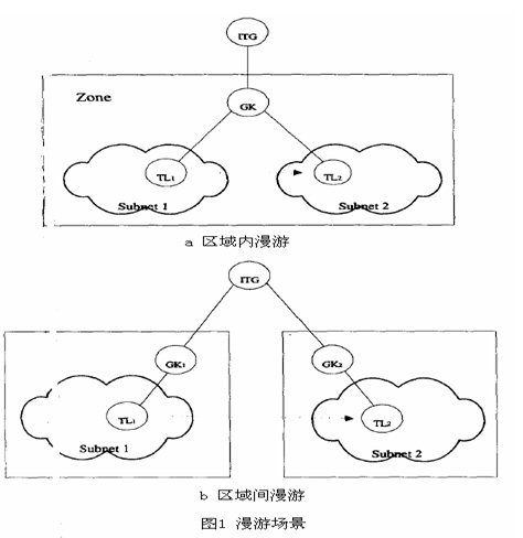 H.323定義中,區(qū)域指由H.323實體(終端、ITG、MCU)組成的集合,并由一個網(wǎng)守進(jìn)行管理。每一個區(qū)域只有一個網(wǎng)守,但允許多個子網(wǎng)通過路由器連接進(jìn)來。對于這種多子網(wǎng)單網(wǎng)守的特性,我們發(fā)現(xiàn)這與GSM系統(tǒng)中的服務(wù)區(qū)類似,網(wǎng)守就相關(guān)于HLR或者VLR。服務(wù)區(qū)中有移動電話終端和代理管理下的基站,類似的一個區(qū)域中有多個子網(wǎng)并都在一個網(wǎng)守的管理下。當(dāng)移動IP電話從一個子網(wǎng)漫游到另外一個子網(wǎng)時,IP電話的IP地址就發(fā)生了變化。如果不做移交處理的話,連接將中斷。