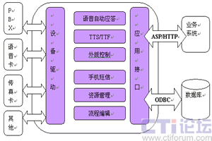 CTI服務(wù)器是整個(gè)系統(tǒng)的核心,通過內(nèi)置電話語音/傳真卡,接入PSTN電話網(wǎng)。該服務(wù)器可作為一個(gè)相對獨(dú)立的系統(tǒng)單獨(dú)運(yùn)行,也可以通過企業(yè)局域網(wǎng)與企業(yè)的業(yè)務(wù)系統(tǒng)連接。