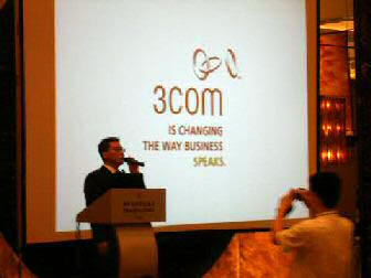 。。2005年8月24日,3Com NBX語音通訊產品推廣會于北京香格里拉大酒店成功舉辦。圖為3Com中國地區(qū)高級市場經理朱海翔闡述3Com產品與市場(點擊察看大圖)