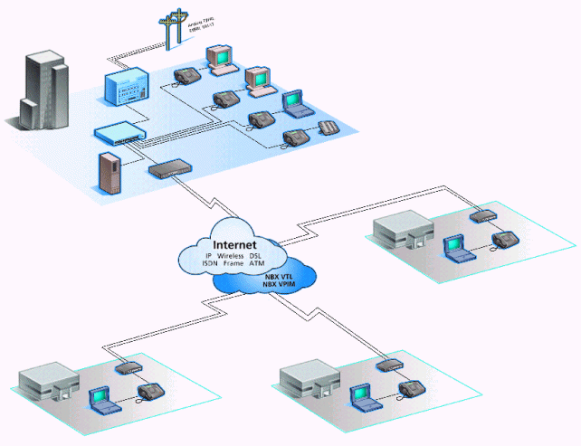 注:企業(yè)架設(shè)NBX通訊系統(tǒng)后,實現(xiàn)SOHO辦公只需要接入Internet架設(shè)VPN網(wǎng)絡(luò),員工可通過小區(qū)寬帶接入或ADSL接入即可實現(xiàn)內(nèi)部通訊就像在企業(yè)內(nèi)部辦公一樣通訊不受任何限制?蛻魜黼姇r只需撥打分機號,無論員工在任何地點都可接聽來電。企業(yè)可以通過TCA(通訊助理)軟件給員工發(fā)送公告、組建電話會議、短信通知等應(yīng)用。
