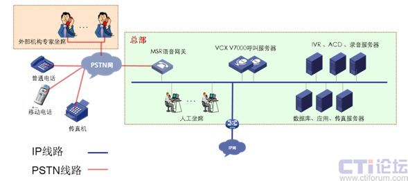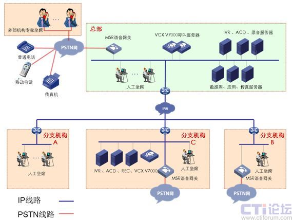 分支機(jī)構(gòu)B:網(wǎng)絡(luò)通過VPN技術(shù)與總部實(shí)現(xiàn)數(shù)據(jù)語音傳輸,部署MSR語音網(wǎng)關(guān)與當(dāng)?shù)豍STN網(wǎng)連接,IP坐席。兩地申請(qǐng)相同的客服號(hào)碼,兩地內(nèi)撥打客服號(hào)碼,客戶無長途話費(fèi)產(chǎn)生。適用與總部與分支處在不同省市。