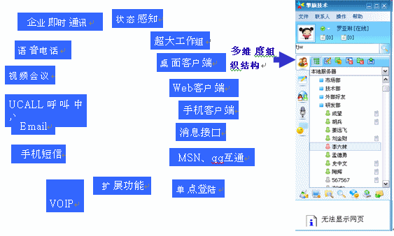UcSTAR:Unified Communication Star,是擎旗技術(shù)研發(fā)的統(tǒng)一通訊平臺(tái),它為企業(yè)提供多種通訊手段(企業(yè)即時(shí)通信、視頻、語(yǔ)音、郵件、短信、電話(huà)、MSN/QQ互通等),并可融合企業(yè)的各種應(yīng)用系統(tǒng)(OA、ERP、CRM、網(wǎng)站、電子商務(wù)系統(tǒng)等);將企業(yè)對(duì)外溝通、銷(xiāo)售和服務(wù)、對(duì)內(nèi)溝通和協(xié)作無(wú)縫整合;輕松實(shí)現(xiàn)無(wú)地域/時(shí)間限制的,可管理、可控制、可擴(kuò)展的,集內(nèi)外部溝通、服務(wù)和銷(xiāo)售一體化的統(tǒng)一工作平臺(tái)。此外,它也可被分離應(yīng)用為企業(yè)IM及實(shí)時(shí)協(xié)作系統(tǒng)、多媒體呼叫中心系統(tǒng)、專(zhuān)業(yè)級(jí)的IP視頻會(huì)議系統(tǒng)等。