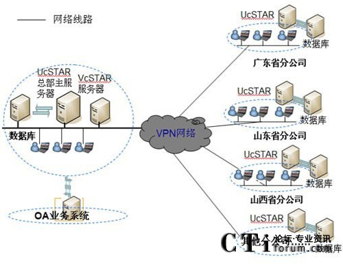 在公司總部部署主UcSTAR服務(wù)器,全國省級分公司分別部署一套子UcSTAR服務(wù)器,組成星型結(jié)構(gòu)公司內(nèi)部的溝通與協(xié)作系統(tǒng)。