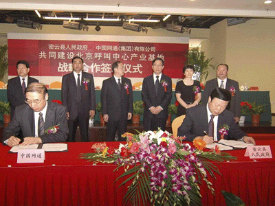簽約儀式在密云瑞海姆田園度假村舉行,雙方就共建北京呼叫中心產(chǎn)業(yè)基地項目簽訂了《共同建設(shè)北京呼叫中心產(chǎn)業(yè)基地戰(zhàn)略合作協(xié)議》,北京市副市長茍仲文同志、中國網(wǎng)通(集團(tuán))有限公司董事長兼總裁左迅生、副總裁姜正新,北京市發(fā)展改革委、規(guī)劃委等市政府相關(guān)部門、密云縣人民政府、中國網(wǎng)通(集團(tuán))有限公司以及多家新聞媒體共計100余人參加了儀式。