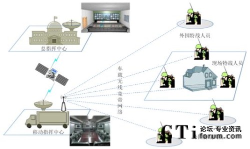 移動指揮中心可在執(zhí)行任務(wù)的時候開往作戰(zhàn)現(xiàn)場附近,車上部署一整套車載調(diào)度平臺,作為現(xiàn)場指揮人員進(jìn)行調(diào)度指揮使用,同時在指揮車上部署無線寬帶網(wǎng)絡(luò),作為戰(zhàn)場使用,移動指揮車和總指揮中心可通過衛(wèi)星網(wǎng)絡(luò)實(shí)現(xiàn)互聯(lián)互通。