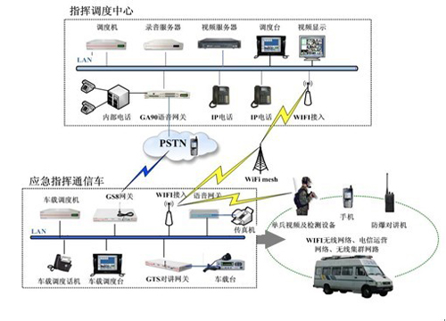 相對,應(yīng)急指揮車配有車載Wi-Fi基站,接入園區(qū)內(nèi)鋪設(shè)的無線寬帶網(wǎng)絡(luò),在園區(qū)無線寬帶覆蓋范圍內(nèi)實現(xiàn)與指揮中心的語音、視頻、數(shù)據(jù)的雙向傳輸。當(dāng)Wi-Fi mesh網(wǎng)絡(luò)無信號覆蓋,指揮車還可通過2G\3G、無線集群等方式與指揮中心進(jìn)行多網(wǎng)融合語音通信。