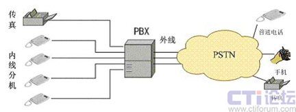 目前大多數企業(yè)使用PBX基于PSTN網絡組建內部電話系統(tǒng),如下圖: