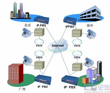 各分支機構租用獨立的電話號碼并接入當地PSTN,在這種架構下,各地之間通話就會產生長途費用,并占用電話線路,但如果使用IP