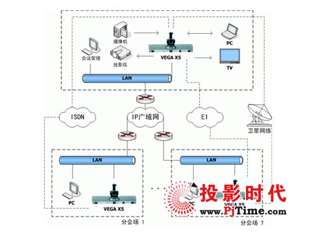 如圖所示,主會場配置1臺愛斯樂VegaX5終端,X5最高帶寬可達(dá)4Mbps。內(nèi)置8點混網(wǎng)(IP&ISDN) MCU。在每個分會場采用1臺愛斯樂VEGA X3終端。各會場根據(jù)網(wǎng)絡(luò)情況,可以采用不同的網(wǎng)絡(luò)接入方式。VEGA X5可以支持寬帶IP、ISDN、專線接入等。且X5的內(nèi)置MCU在召開多點會議時可以做雙視頻流傳送,可以同時看到多會場的圖像,聲音也是全部混合的。
