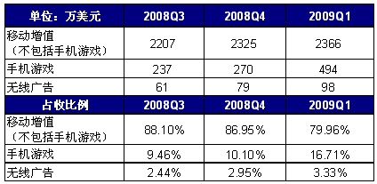 2009年第1季度,空中網(wǎng)手機游戲服務(wù)營收為494萬美元,同比增長304%,環(huán)比增長83%;其中手機網(wǎng)游的營收為72萬美元,同比增長379%,環(huán)比增長11%,單機游戲和WAP頁面游戲的服務(wù)營收為422萬美元,同比增長293%,環(huán)比增長106%。手機游戲業(yè)務(wù)在空中網(wǎng)銷售收入中所占比重由2008年第4季度的10.10%上漲至16.71%。