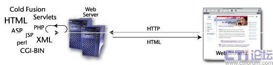 在互聯(lián)網(wǎng)上,瀏覽器通過Internet協(xié)議――比如HTTP――向Web服務(wù)器發(fā)出請求,而Web服務(wù)器上存放著靜態(tài)頁面和動態(tài)應(yīng)用,它們將把HTML返回給瀏覽器,最終結(jié)果在瀏覽器中展現(xiàn)出來。如下圖所示:
