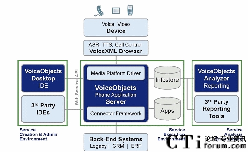VoiceObjects體系結構支持輕松地開發(fā)、部署和維護帶有語音、視頻、文本和移動互聯網接口的電話應用。通過緊密集成提供實時分析的VoiceObjects分析器和提供應用創(chuàng)建與維護的VoiceObjects桌面,VoiceObjects服務器成為提供動態(tài)對話和接口生成的執(zhí)行引擎。