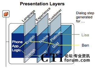 如圖所示,客戶(hù)通過(guò)電話(huà)或移動(dòng)互聯(lián)網(wǎng)訪(fǎng)問(wèn)花旗銀行,根據(jù)電話(huà)號(hào)碼或登錄信息,后臺(tái)系統(tǒng)將自動(dòng)獲知客戶(hù)需要的卡服務(wù)類(lèi)型,然后客戶(hù)可以選擇服務(wù)語(yǔ)言,結(jié)合客戶(hù)使用系統(tǒng)的熟練程度和客戶(hù)級(jí)別,最終客戶(hù)將被導(dǎo)向不同的操作界面。