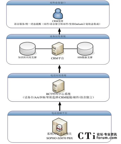 原先電話系統(tǒng)與CRM系統(tǒng)是獨(dú)立的兩個(gè)系統(tǒng),客服人員面對大量的客戶,迅速的獲悉來電客戶的身份、背景資料以及歷史資料在很大程度上決定了其服務(wù)質(zhì)量。BCT呼叫中心系統(tǒng)位于PBX與CRM之間,作為一個(gè)中間的橋梁,對PBX送來的電話信息或者用戶輸入的卡號(hào)等數(shù)據(jù)進(jìn)行處理分析,對主叫號(hào)碼或用戶輸入卡號(hào)進(jìn)行識(shí)別后,傳遞給CRM;CRM檢索與其相連的HIS(醫(yī)院信息系統(tǒng))的數(shù)據(jù)庫,將客戶資料以及相關(guān)的歷史記錄通過彈出網(wǎng)頁的模式,同步的顯示在坐席的計(jì)算機(jī)上,方便客服代表的輸入和后續(xù)操作,提高了效率與正確率。同時(shí),客戶代表還可以在CRM頁面中點(diǎn)擊電話號(hào)碼,通過BCT發(fā)起電話呼叫來聯(lián)系客戶,來處理用戶回訪等工作。