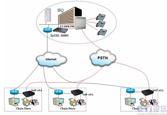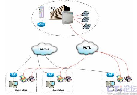 通過這種架構(gòu),各連鎖分店的話機(jī)與總部?jī)?nèi)部話機(jī)之間的聯(lián)系便可以透過IP網(wǎng)絡(luò)進(jìn)行,無須再支付任何長(zhǎng)途通話費(fèi)用。