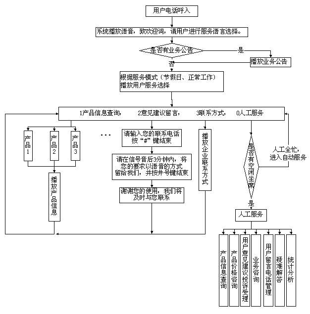 通過(guò)電腦語(yǔ)音引導(dǎo),提示按鍵的方式,用戶通過(guò)電話、傳真等可自動(dòng)獲取企業(yè)的相關(guān)信息,如公司介紹、聯(lián)系方式、產(chǎn)品信息介紹等,以及對(duì)產(chǎn)品的投訴建議,留言,留聯(lián)系電話等;