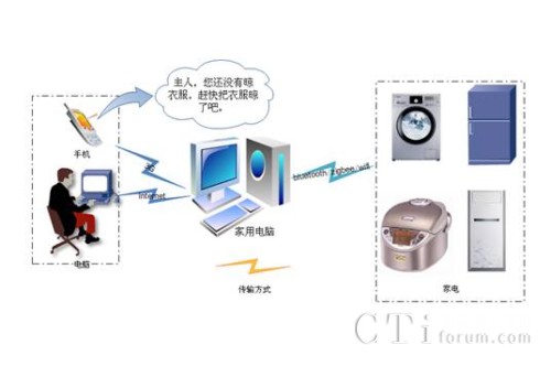 家電遠控系統(tǒng)的原理是利用電腦或者手機的電源管理系統(tǒng),來管理用戶終端軟件管理電源的開關、定時、預設時間等,利用互聯(lián)網(wǎng)或者手機網(wǎng)絡把信號傳輸?shù)郊彝ル娔X,家庭電腦當作小型服務器或者信號轉發(fā)點,把信號利用藍牙、zigbee、wifi等無線傳輸?shù)街付ǖ碾娫床遄,當然每個電源插座都要有相應的信號接收模塊實現(xiàn)和家庭電腦的信號傳輸,實現(xiàn)了對電源的管理功能。家電遠控終端軟件嵌入語音合成軟件,利用合成語音報讀預設的提醒內(nèi)容和時間提醒,具有危急情況下的報警功能。當然如果我們是在家里,可以直接用手機通過藍牙對電源插座進行管理,或者通過家庭電腦進行管理。如圖所示: