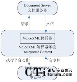 VoiceXML解析器上下文和VoiceXML解釋器負(fù)責(zé)解析VoiceXML文件,控制執(zhí)行平臺。執(zhí)行平臺提供合成語音的輸出(text to