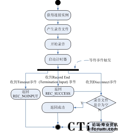 5)如果接收到SC_EVENT_DISCCONET事件,表示用戶主動(dòng)放棄,轉(zhuǎn)到步驟7;如果接收到SC_EVENT_TIMEOUT事件,表示用戶在計(jì)時(shí)器的時(shí)間內(nèi)沒有輸入,返回REC_NOINPUT,調(diào)用EndSession,流程結(jié)束;如果接收到SC_EVENT_RECORD_RECEIVED事件,表示用戶錄音完畢,進(jìn)入下一步;