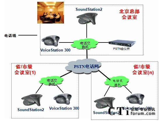 根據客戶的要求,本著“完善、經濟、高效”的原則,我們制定了以下解決方案;系統利用傳統電話網絡,擁有自己的會議管理系統;北京總部方面使用Polycom SS2基本型商務會議電話;各個省/市級分會場,根據自己會場的情況自選設備;