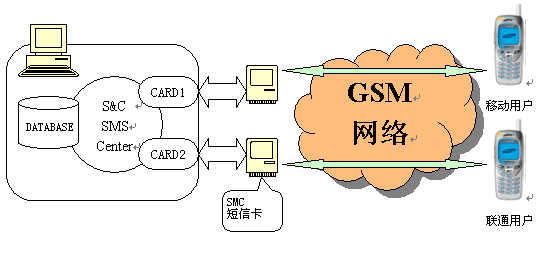 采用短信卡方式的短信系統(tǒng)結(jié)構(gòu)如下圖,短消息通過內(nèi)置PCI短信卡發(fā)送,通過靈活多變的接口,與其他系統(tǒng)集成,組成短信應用系統(tǒng)。