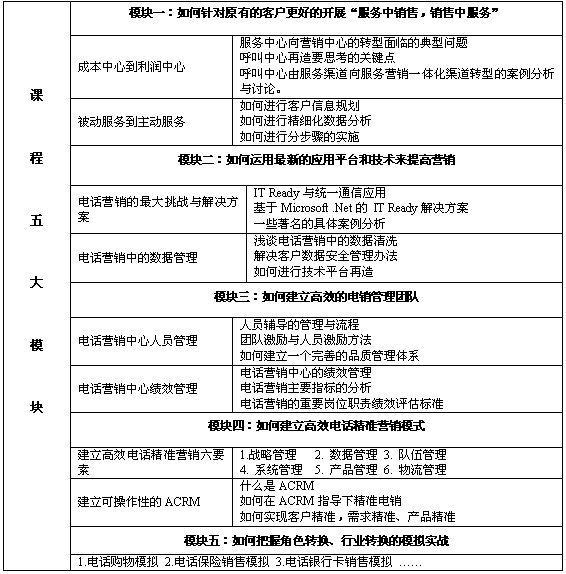 本課程以系統(tǒng)化的眼光,結(jié)合多個(gè)國(guó)際國(guó)內(nèi)領(lǐng)先企業(yè)的營(yíng)銷與管理實(shí)踐案例,與您分享國(guó)內(nèi)領(lǐng)先的呼叫中心和電話營(yíng)銷中心的戰(zhàn)略與運(yùn)營(yíng)經(jīng)驗(yàn),對(duì)現(xiàn)有資源進(jìn)行合理評(píng)估,解決實(shí)際問題與困惑,突破面臨的瓶頸,整個(gè)課程具有高度的實(shí)戰(zhàn)性與可操作性。