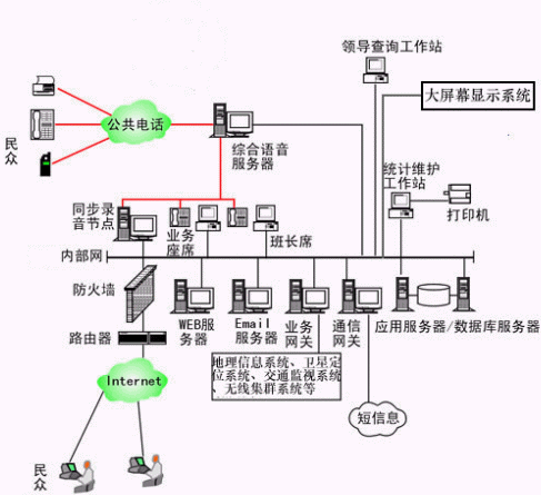 本系統(tǒng)物理結(jié)構(gòu)由語音交換機、座席分流器、呼叫管理服務(wù)器(CTI服務(wù)器)、IVR(交互式語音應(yīng)答)/IFR(交互式傳真應(yīng)答、業(yè)務(wù)代表座席、調(diào)度席、統(tǒng)計維護管理工作站、數(shù)據(jù)庫/應(yīng)用服務(wù)器、通信網(wǎng)關(guān)服務(wù)器、業(yè)務(wù)網(wǎng)關(guān)服務(wù)器、錄音工作站、領(lǐng)導(dǎo)查詢工作站、大屏幕顯示系統(tǒng)、網(wǎng)絡(luò)系統(tǒng)等構(gòu)成。
