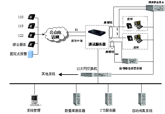 綜合接警平臺主要由hxd09可編程智能語音交換機和計算機網(wǎng)絡兩部分組成,交換機負責110、119、122報警電話的接入與分流及調(diào)度呼出等功能;計算機網(wǎng)絡則完成110、119、122報警信息的顯示、數(shù)據(jù)儲存、統(tǒng)計及信息查詢、發(fā)布功能。