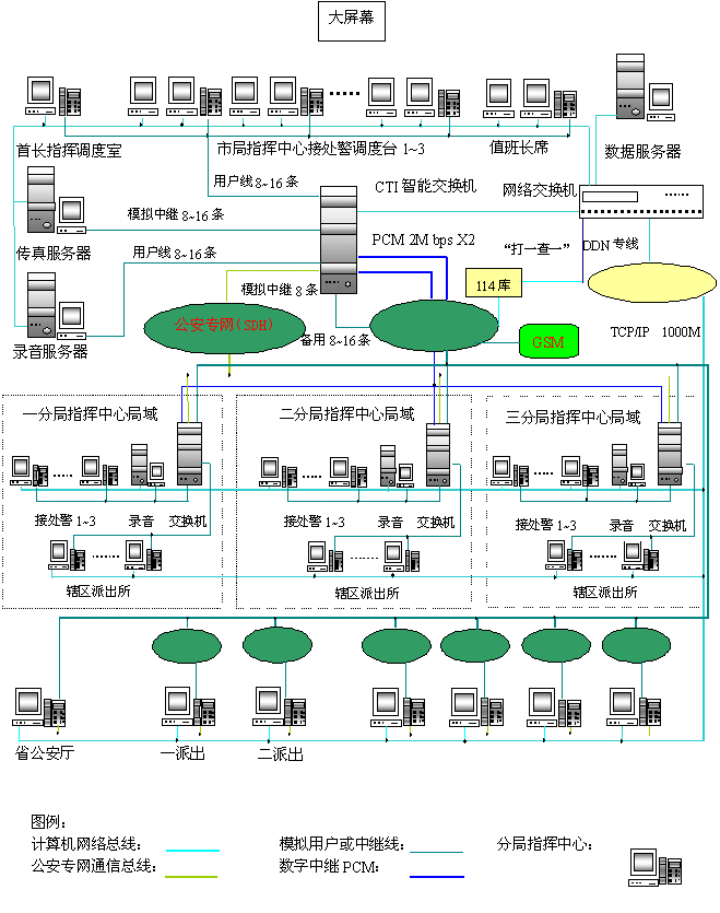 - 樹立大網(wǎng)絡概念:采用先進的通訊、計算機網(wǎng)絡技術(shù)(采用CTI可編程交換技術(shù)),利用現(xiàn)有的通信資源,實現(xiàn)市局指揮中心與消防大隊、交警大隊、各派出所的計算機網(wǎng)絡及相關(guān)領(lǐng)導辦公室計算機大聯(lián)網(wǎng);形成全市范圍內(nèi)110、119、122有線、無線全方位立體調(diào)度語音通道大網(wǎng)。