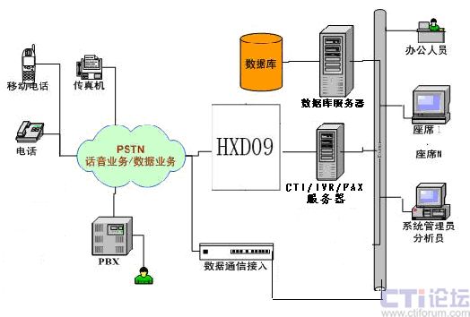 “系統(tǒng)”主要由以下幾部分組成:HXD09語音交換機、CTI Server服務器、數(shù)據(jù)庫系統(tǒng)、業(yè)務處理系統(tǒng)以及座席(業(yè)務代表)、呼叫管理系統(tǒng)、呼叫監(jiān)控系統(tǒng)幾項業(yè)務組成。