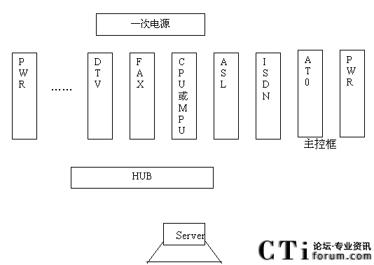 - CPU為256路主控板,對整個系統(tǒng)進(jìn)行主控,為整個系統(tǒng)提供時鐘入同步信號及交換網(wǎng),含一個10Base-T以太網(wǎng)口,通過HUB與Server進(jìn)行控制信息的交互
