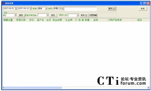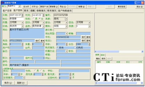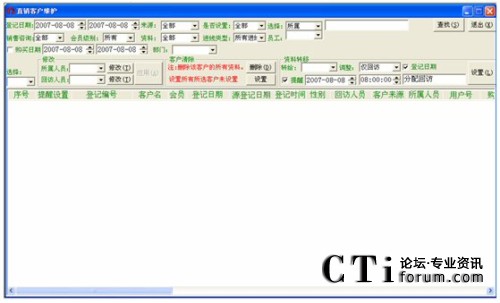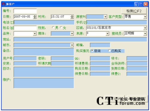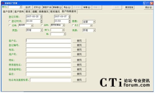 注:對(duì)于登記日期一直到客戶(hù)名這一段條件的查詢(xún)(即上圖中所有的那些查詢(xún)條件),都得點(diǎn)擊客戶(hù)名欄對(duì)應(yīng)的那個(gè)查找按鈕才能進(jìn)行有效的查找,否則若點(diǎn)擊其它按鈕(姓名電話(huà)直接檢索對(duì)應(yīng)的查找除外),都會(huì)提示“請(qǐng)輸入****”這種錯(cuò)誤信息。而點(diǎn)擊最后一個(gè)查找,也是無(wú)效的,會(huì)轉(zhuǎn)到客戶(hù)管理中空白信息欄(即什么也查不到)。