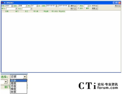 在員工通話(huà)統(tǒng)計(jì)中,從選擇欄中可以選擇日?qǐng)?bào)、周報(bào)、月報(bào)、季報(bào)、年報(bào)這五種統(tǒng)計(jì)方式,分別統(tǒng)計(jì)當(dāng)天、當(dāng)周、當(dāng)月、當(dāng)季、當(dāng)年的員工的通話(huà)信息(呼入電話(huà)的個(gè)數(shù)、呼出電話(huà)的個(gè)數(shù)、呼入通話(huà)的時(shí)長(zhǎng)、呼出通話(huà)的時(shí)長(zhǎng))。