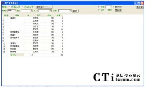 可以對(duì)進(jìn)線進(jìn)行日統(tǒng)計(jì)、周統(tǒng)計(jì)、月統(tǒng)計(jì)、季度統(tǒng)計(jì)、年度統(tǒng)計(jì),并分別可對(duì)部門(mén)、員工、品種等進(jìn)行組合式的查詢(xún)。