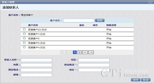 聯(lián)系人管理與客戶管理操作方法大致相同,功能相當(dāng)于客戶管理下客戶資料內(nèi)的添加聯(lián)系人功能。您可以按客戶名稱為搜索條件選擇所要添加聯(lián)系人的目標(biāo)客戶。
