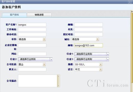 對新添加的客戶錄入客戶信息資料,包括客戶的名稱、郵箱等,為其建立起一個新的客戶關(guān)系,可以隨時找到該客戶的具體信息以及他的銷售情況,方便對客戶銷售進(jìn)程有一個充分地實(shí)時跟蹤,并為之更好地服務(wù)。