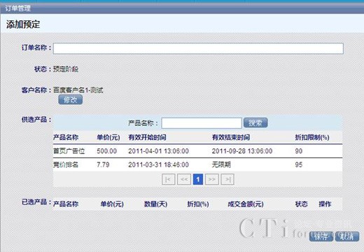 選擇訂單的名稱,供客戶選擇的產(chǎn)品,在供選產(chǎn)品列表下選擇產(chǎn)品名稱,然后所選的產(chǎn)品就會出現(xiàn)在已選產(chǎn)品列表下,完成后點(diǎn)擊【保存】,這樣一個訂單就生成了。