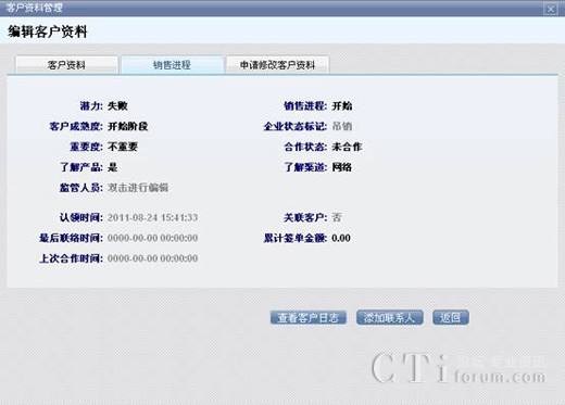點(diǎn)擊標(biāo)簽選擇要查看的客戶資料,和銷售進(jìn)程。查看客戶日志能看到該客戶被執(zhí)行操作的歷史情況,例如資料的變更,所屬的變更等等。添加聯(lián)系人是指為當(dāng)前客戶添加新的聯(lián)系人,添加完聯(lián)系人信息后,聯(lián)系人就會被納入到該客戶資料里。