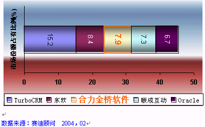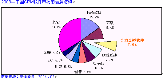 2004年2月10日,北京。賽迪顧問(CCID Consulting )在中國大飯店隆重舉辦了"2004IT市場(chǎng)年會(huì)", 會(huì)上發(fā)布了《2003-2004年中國管理軟件產(chǎn)業(yè)投資機(jī)會(huì)研究年度報(bào)告》。HOLLYCRM(合力金橋軟件)公司在強(qiáng)手如林的評(píng)選中憑借其強(qiáng)勁的市場(chǎng)占有份額、深厚的品牌實(shí)力及出眾的用戶美譽(yù)度無可爭議地穩(wěn)居2003年度中國CRM軟件整體市場(chǎng)份額前三甲, 同時(shí)更奪得了2003年度中國電信行業(yè)CRM市場(chǎng)份額龍頭位置。