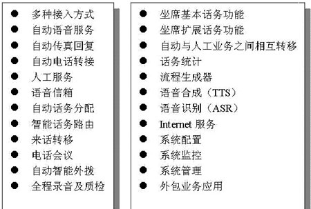 1. 接入及交換處理系統(tǒng)。此部分重點(diǎn)考慮用戶的呼叫接入和呼出、呼叫轉(zhuǎn)接處理需求,分析提供電話、傳真、信函、Web、E-mail、WAP、短信、視頻等方式的接入選擇。考慮分析用戶呼叫要求和數(shù)據(jù),將該數(shù)據(jù)傳遞給業(yè)務(wù)處理和業(yè)務(wù)管理系統(tǒng),同時(shí)接收業(yè)務(wù)處理和業(yè)務(wù)管理系統(tǒng)的交換請(qǐng)求,對(duì)各種電話交換資源、語音資源、傳真資源、坐席資源等進(jìn)行統(tǒng)一管理和調(diào)度分配,進(jìn)行呼叫的排隊(duì)和交換。它包括PBX/ACD (自動(dòng)呼叫分配)、IVR(交互語音應(yīng)答)、CTI、傳真系統(tǒng)、短信平臺(tái)、坐席軟電話、錄音、呼出系統(tǒng)、ICC(Internet呼叫中心)等子系統(tǒng)。