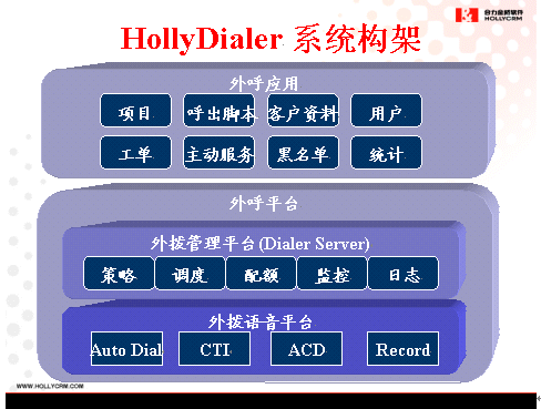 HollyDialer是HOLLYCRM(合力金橋軟件)公司自主開發(fā)的外撥業(yè)務綜合平臺,作為HollyC6呼叫中心系統(tǒng)的增值軟件,HollyDialer主要圍繞客戶實現(xiàn)相關的主動服務,完成市場調(diào)查、客戶回訪、電話營銷等多種類型的外撥任務。外撥設備支持多種主流交換平臺的無縫集成,能夠靈活定制自動、人工外撥策略,實現(xiàn)預覽式、預測式、多種智能外撥模式,為企業(yè)建設盈利型的呼叫中心提供了最為便捷的工具,