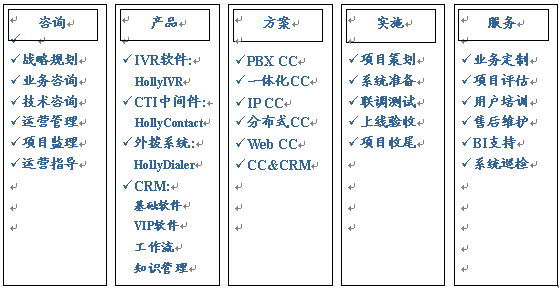 HollyC6支持的業(yè)務類型包括:客戶服務中心、咨詢熱線、電子商務中心、服務受理中心、預訂中心、電話營銷中心、技術支持中心等。